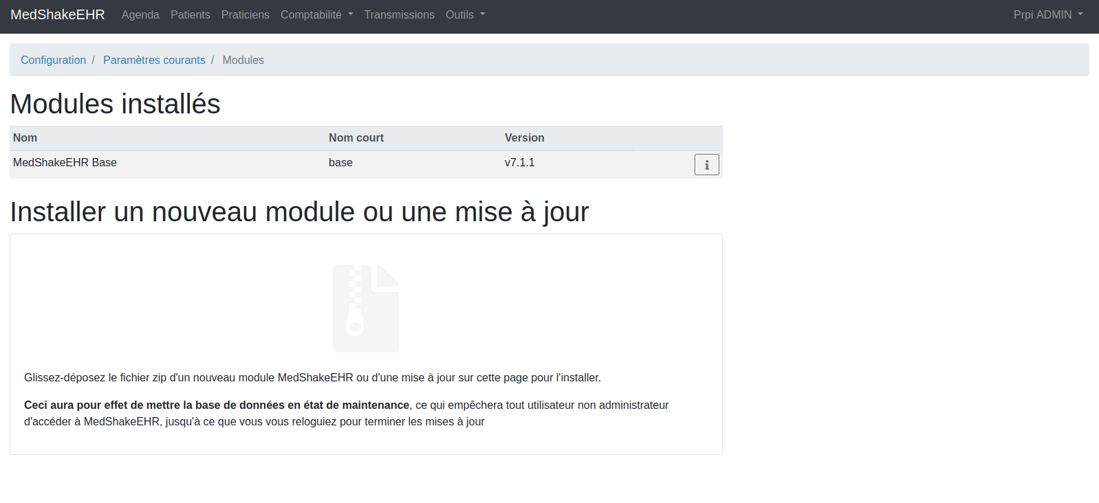 Je pense que vous avez récupérer l'archive zip directement sur github. Ces archives ne sont pas exploitable tel quel. La faute au script d'installation de module de Medshake qui recherche un fichier .MedShakeEHR à la racine de l'archive zip, or les archive zip disponible sur github place les fichier du module dans un dossier au nom du module dans l'archive du coup le fichier .MedShakeEHR n'est pas trouvé à la racine.
